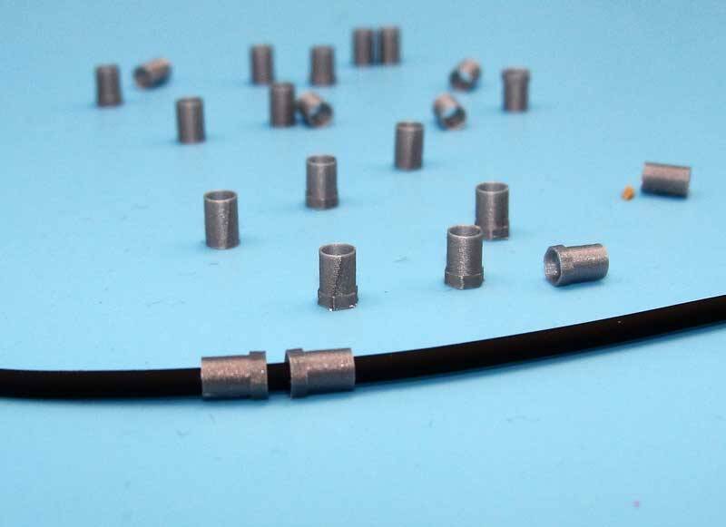 Deze koppelingen zijn bedoeld voor gebruik met onze 1.7mm rubber slang, om bijv. een hydrauliek aansluiting te maken. Het zijn in feite holle buisjes, geprint met een wanddikte van 0.2mm, die over de slang geschoven kunnen worden. Je kunt ze gebruiken als aansluitpunt op de machine, maar ook als koppeling tussen 2 slangen.